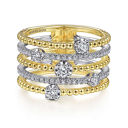 Alternating bands of beaded 14K yellow gold and shimmering pavé diamonds set in cool 14K white gold adorn this layered fashion ring. Constructed as a single wide band, it offers the look of five rings in one. Finished with five round stations, this Bujukan ring boasts 0.56 cts of diamonds.