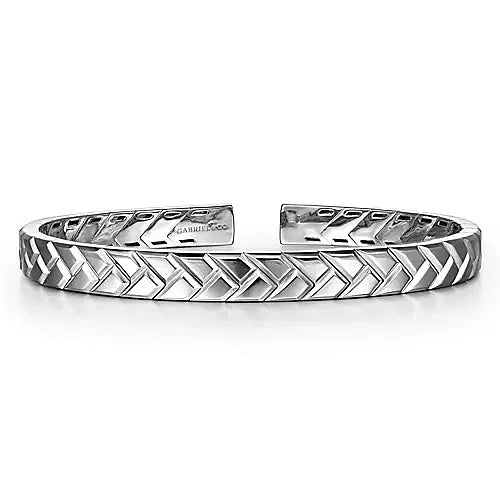 A modern herringbone pattern gives this mens cuff bracelet a unique woven appearance. The geometric motif is effortless and versatile for casual and dressy occasions. This slip-on style is created in 925 Sterling Silver with a bright polish.