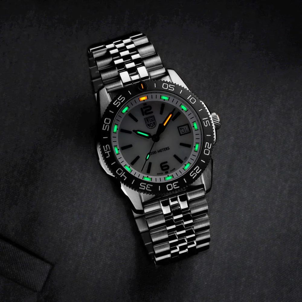 The Pacific Diver Ripple collection takes its design from the popular Pacific Diver, launched in 2020. The Ripple is available in a 39mm case size to appeal to a wider range of casual explorers and aquatic aficionados, while remaining true to the Luminox brand DNA. Combining a stainless steel case, together with a CARBONOX™ bezel, results in an eye-catching fusion of materials. The Mother-Of-Pearl dial is a refreshing combination with the Jubilee 316L stainless steel bracelet. As with any Luminox, it features our cutting-edge Luminox Light Technology, for self-powered illumination for up to 25 years.