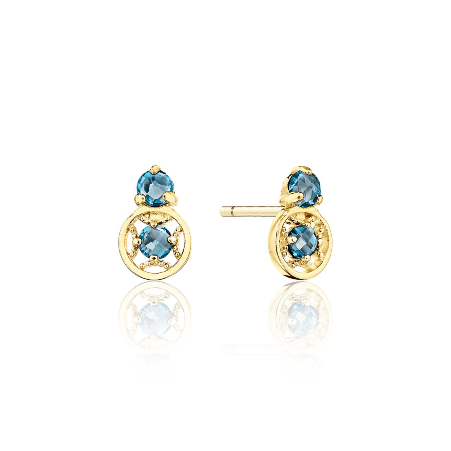 Color this small can still make a strong style statement. Two petite London Blue Topaz gemstones are set in an intricate yellow gold crescent basket to deliver a bold yet delicate style expression.